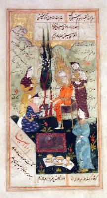 Історія предмета, легендаКоментар до сцени: «Служниці Зулайхи розважають Юсуфа в саду». У намаганні завоювати серце Юсуфа Зулайха запрошує його до свого саду, де прекрасні дівчата-служниці розважають юнака піснями, танцями та ласощами. Зулейха сподівається, що Юсуф спокуситься бодай однією з дівчат, і тоді вона зможе непомітно підмінити обраницю і добитися коханого. Однак, Юсуф не зважає на красу та частування дівчат і весь вечір проповідує їм про Бога. На мініатюрі ми бачимо Юсуфа в помаранчевому вбранні та білому тюрбані з характерним німбом довкола голови. Він сидить на високому кріслі в саду, на що вказують два тоненькі кіпариси. Юсуф простягає руку до чаші з частуванням, яку йому подає уклінна служниця в синьому вбранні. За спиною Юсуфа стоїть інша дівчина, яка тримає в руках золоту чашу з конусовидною кришкою. Схожу чашу тримає й третя дівчина, яку зображено вгорі ліворуч. Ще одна служниця стоїть праворуч унизу, перед нею на землі серед квітів – біла скатертина, заставлена золотими чашами й чарками.