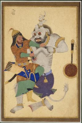 Історія предмета, легендаАркуш з рукопису епічної поеми "Шахнаме" (Книга Царів) Хакіма Абулькасима Мансура Хасана Фірдоусі Тусі, ірано-такжикського поета, класіка іранської, таджикської та афганської літератур. Т.1, М.1957, вірші 12230-12250 Рустем - герой іранського епосу, богатирські подвиги якого оспівані в поемі “Шахнаме” Фірдоусі (близько 940 - 1020/1030). Вбивство Білого Дива - один з семи подвигів Рустема, здійснений з метою урятувати царя Кей-Кавуса, який потрапив у полон до Дива під час походу на Мазендаран. Коментар до аналогії: http://www.fitzmuseum.cam.ac.uk/gallery/shahnameh/vgallery/section4.html?p=71 As in No. 47, Rostam has defeated the White Div and is extracting its liver to cure the blindness of Key Kavus. This image exemplifies a new fashion for the selection of celebrated episodes, individual figures or small groups for inclusion in albums of drawings and paintings: the traditional two-figure group has been changed from a horizontal to a vertical position. Persian painting on silk is known from c.1400 and tends to be associated with Tabriz or Herat. The Shahnameh records that silk was the normal support for letters exchanged between sovereigns.